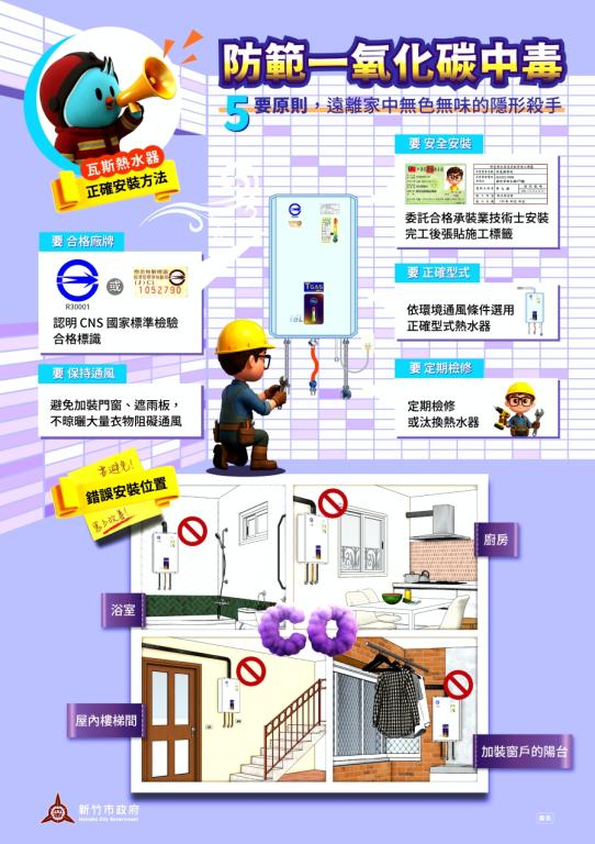 ▲為避免發生一氧化碳中毒意外,竹市消防局提醒市民居家使用燃氣熱水器等,均應保持室內通風良好。(圖/竹市府提供)