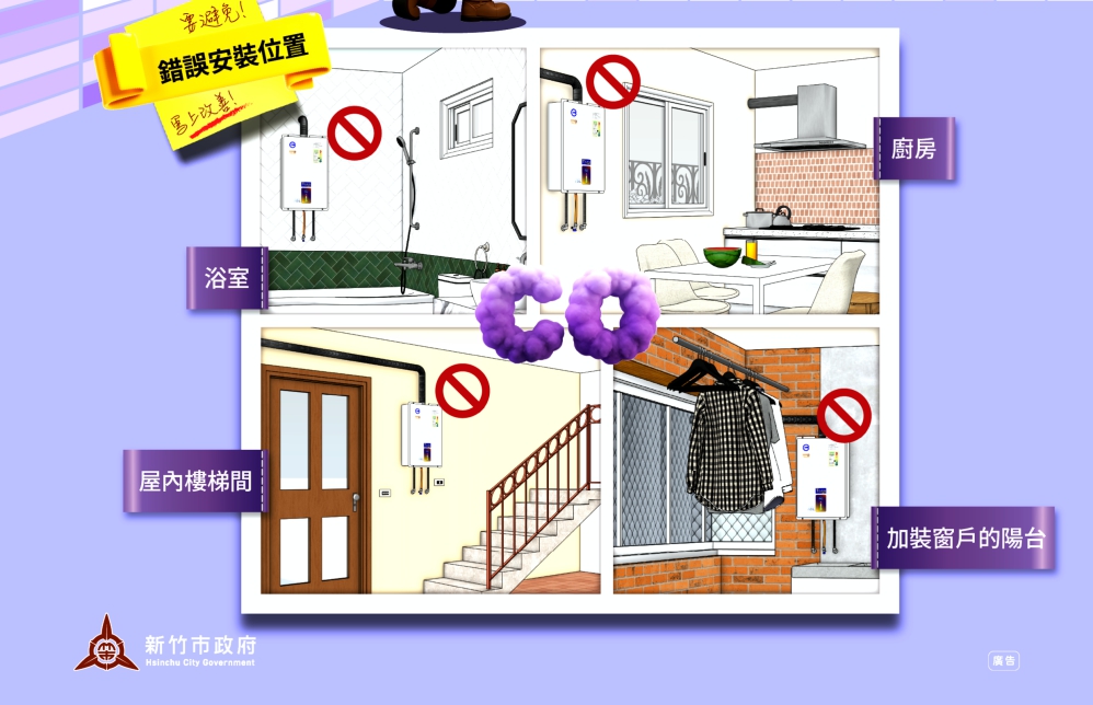▲為避免發生一氧化碳中毒意外,竹市消防局提醒市民居家使用燃氣熱水器等,均應保持室內通風良好,同時也要避免錯誤安裝位置。(圖/竹市府提供)