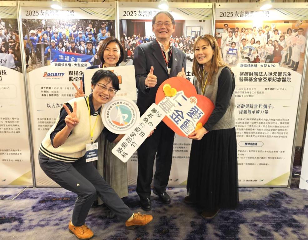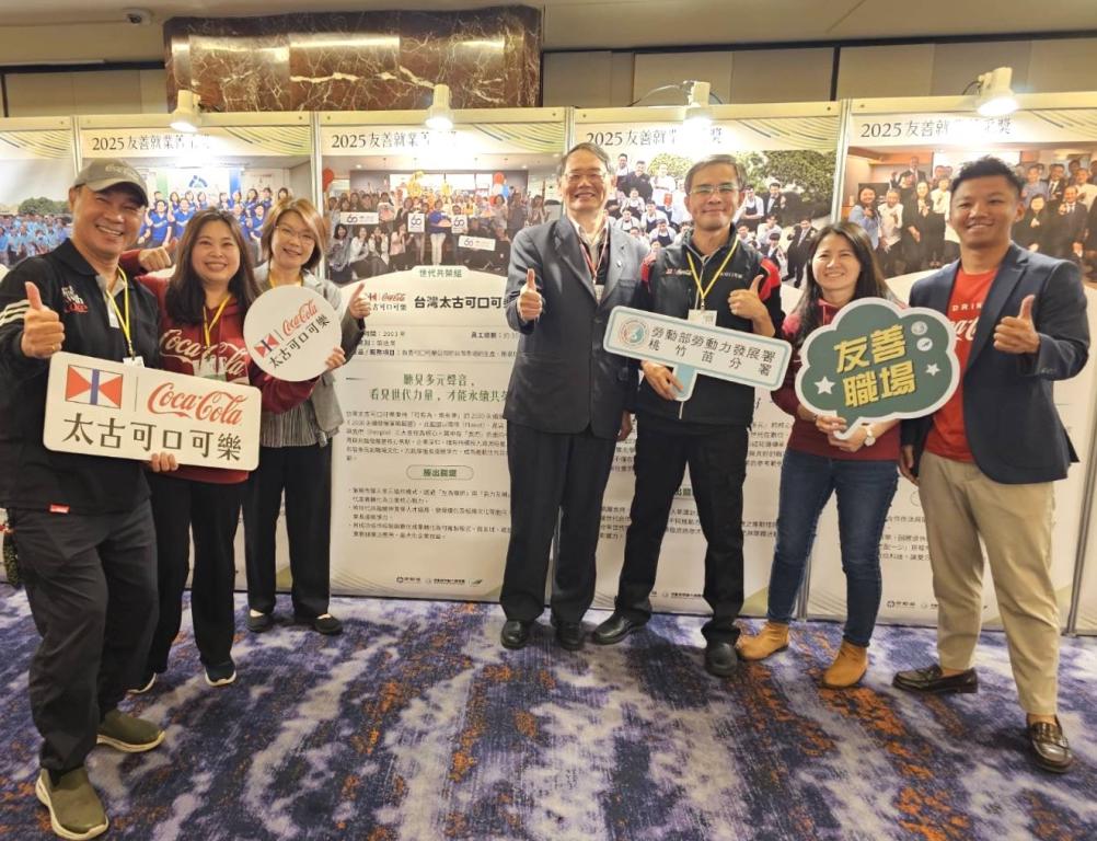 為維護中高齡者及高齡者就業權益,鼓勵企業建構友善就業環境,勞動部12/22日舉辦「友善就業菁采獎」頒獎典禮,表揚具體落實友善措施與展現永續用才價值的優秀單位。桃竹苗分署輔導轄區企業表現亮眼,太古可口可樂、財團法人新竹市天主教仁愛社會福利基金會、實耐格科技股份有限公司、碩陽電機股份有限公司、達穎塑膠股份有限公司、環球晶圓股份有限公司等6家企業脫穎而出,展現桃竹苗分署與企業攜手推動友善職場的深厚成果。