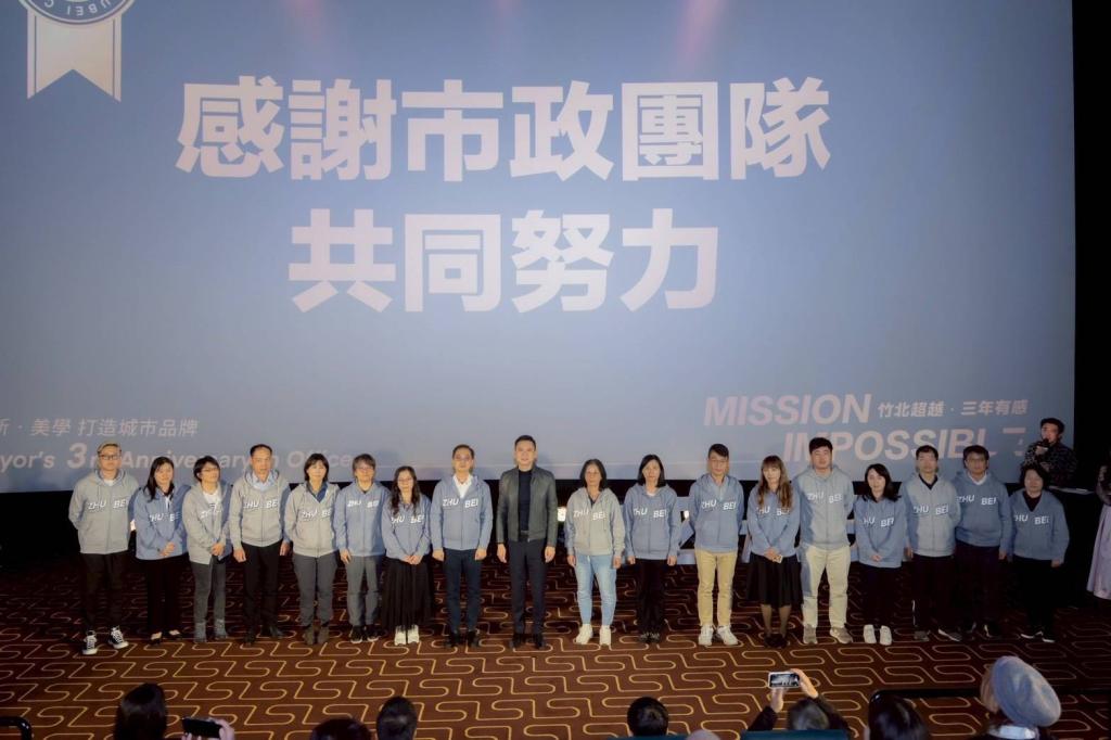 ▲竹北市公所12/24日舉辦「三週年市政感恩分享會」,竹市長鄭朝方(後排中)向市民報告,其任內竹北成為最大縣轄市,並完成一項項《不可能的任務》。(圖/竹北公所提供)