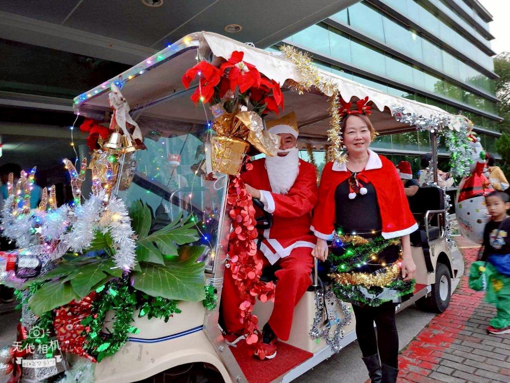 傍晚時分,隨著天色漸暗,現場燈光悄然熄滅;在一片期待中,精心裝飾聖誕雪橇車伴隨著輕快聖誕歌曲緩緩進場,瞬間點燃現場氣氛;隨後,點燈儀式正式啟動,家主任姚辰蕙與住民代表共同按下啟動鈕,園區內聖誕樹與周邊燈飾瞬間綻放璀璨光芒。