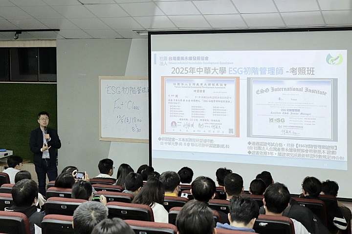 ▲中華大學ESG初階管理師考照班開課首日吸引百位師生、校友及校外夥伴熱情參與,共同精進專業能力,展現中華大學推動跨域學習與證照教育的成果。(圖/中華大學提供)
