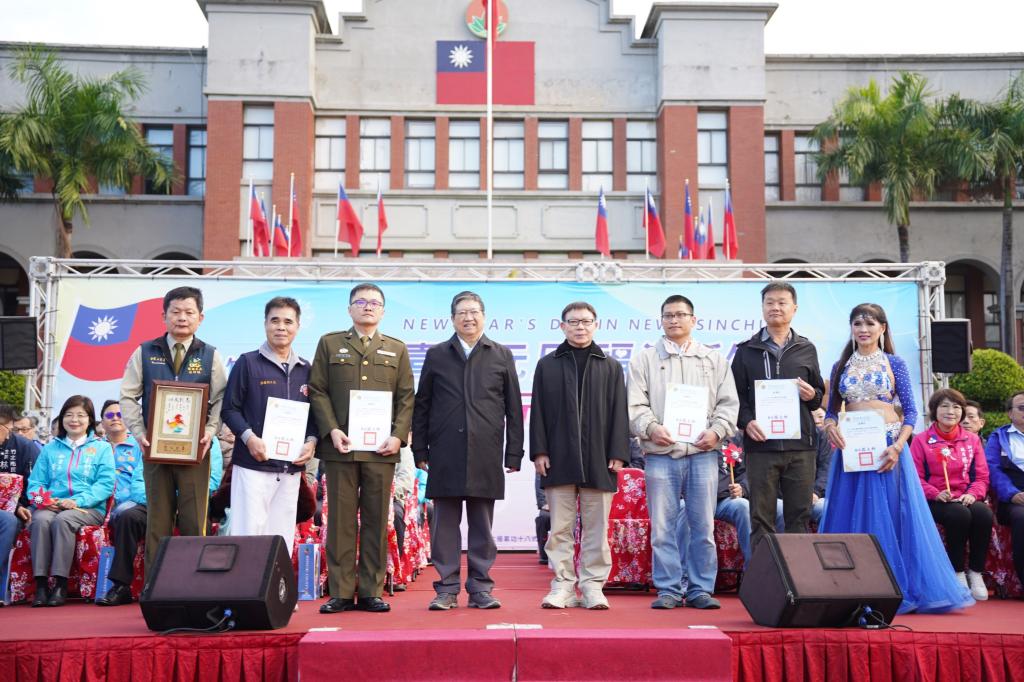 ▲竹縣府於今(115)年元旦於府前廣場舉辦元旦升旗典禮,楊文科縣長(左4)致贈感狀予活動協辦單位並一同合影。(圖/竹縣府提供)