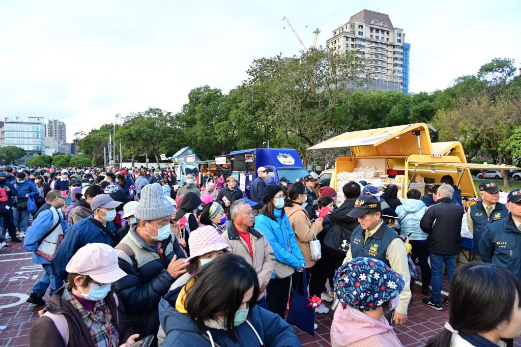 今年除了有升旗紀念品之外,現場還安排早安市集,民眾憑當日隨紀念品發送的「早安市集兌換券」,就可擇一餐車兌換1份餐點,限量2026份,吸引無數鄉親到場排隊,現場人潮滿滿、人氣滾滾。