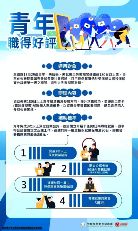 此外,勞動部在115年1月1日修正「青年職得好評計畫」規定,除協助長期待業的青年,更擴大適用到待業期間有從事部分工時工作的青年,只要至台灣就業通網站( https://job.taiwanjobs.gov.tw )加入會員及登錄履歷資料、完成線上職涯測評,備妥申請書、國民身分證、畢(肄)業證書等文件,至桃竹苗分署各就業中心提出申請,中心將安排專業職涯諮詢師提供一對一的深度就業諮詢,並結合職涯測評工具,協助青年精準媒合工作機會;除加強就業媒合外,也提供成功就業青年穩定在職滿3個月的3萬元尋職就業獎勵金,希望透過此計畫讓青年釐清職涯方向,進而轉正職穩定就業。