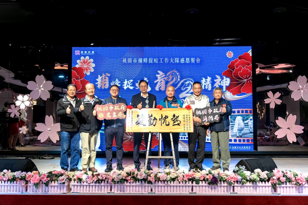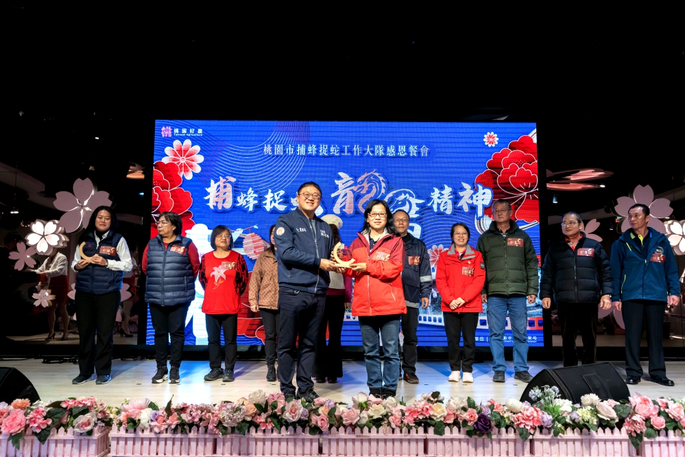 桃園市長張善政表示,過去10年桃園市捕蜂捉蛇大隊勞苦功高,10年完成10萬餘件蜂蛇案,平均每年1萬件,感謝捕蜂捉蛇大隊讓市民擁有安居環境。而這項業務因應中央政策趨勢,今(115)年起正式轉型,委由民間專業廠商辦理,捕蜂捉蛇大隊人員自此卸下肩上重擔,市府特別舉辦感恩餐會向每位捕蜂捉蛇大隊同仁致敬;活動也同步表揚114年度13位績優人員,其中包含4位女性隊員,以溫柔女力守護市民人身安全。