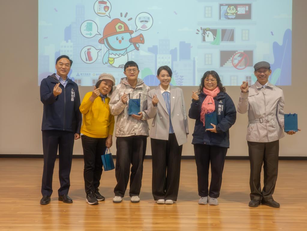 ▲竹市府辦理13場次高層集合住宅住戶防災宣導,首場防災宣導今(1/8)日晚間在身心障礙者就業綜合大樓登場,市長高虹安(左4)、消防局長李世恭(左1)和有獎徵答活動獲獎民眾合照。(圖/竹市府提供)