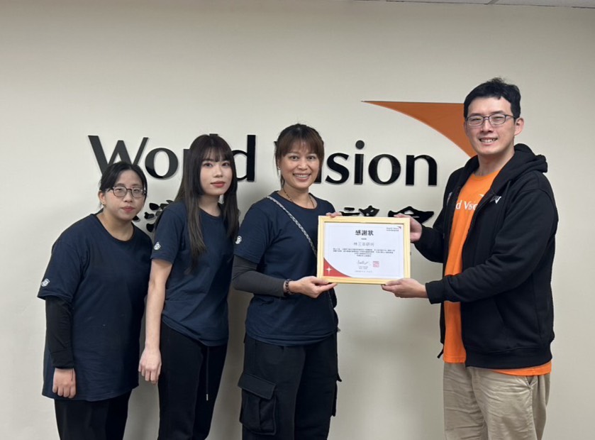 ▲台灣世界展望會桃園二中心督導致贈感謝狀(右1) 感謝林三茶研所支持兒少培力(左起三位)。(圖/台灣世界展望會提供)