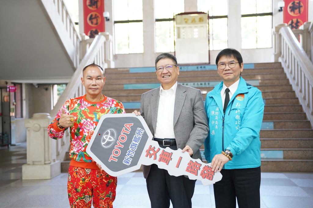 ▲啟德機械起重工程捐贈災情勘查車助竹縣消防守護民眾生命財產。啟德機械起重工程董事長胡漢龑(左)、楊文科縣長(中)及消防局局長陳中振(右)一同合影。 (圖/竹縣府提供)