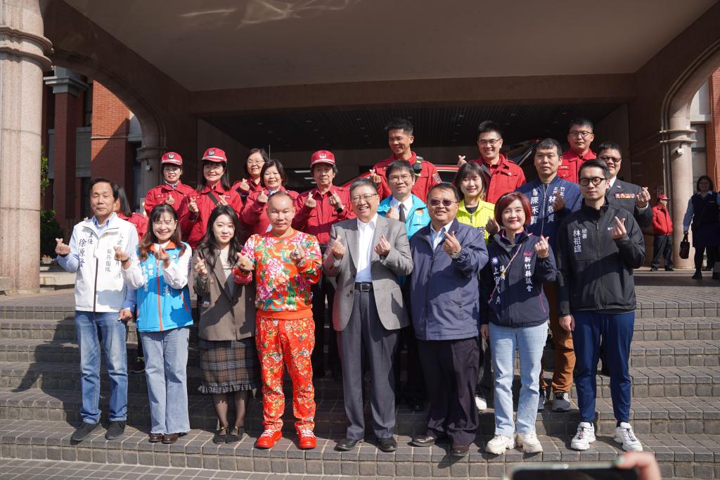 ▲啟德機械起重工程捐贈災情勘查車助竹縣消防守護民眾生命財產。啟德機械起重工程董事長胡漢龑(前排左4)、楊文科縣長(前排右4)及與會來賓一同合影。 (圖/竹縣府提供)