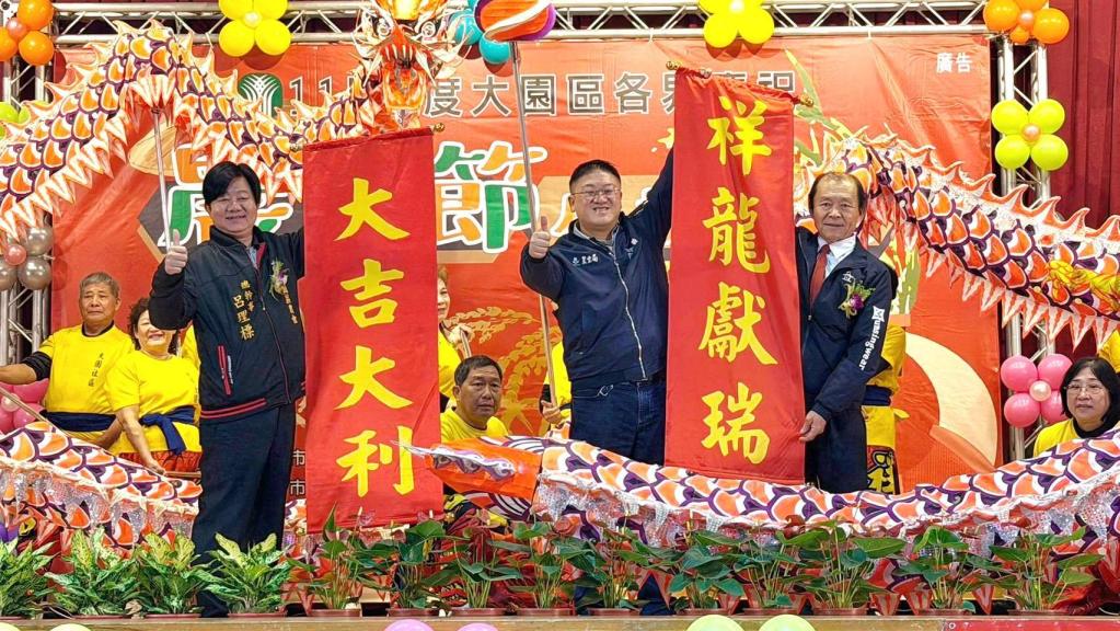 ▲桃園市大園區各界慶祝農民節大會活動今(1/13)日隆重登場,農業局長陳冠義(中)、大園區農會理事長謝岳龍(右)、總幹事呂理標(左)一同向來賓及民眾拜早年。(圖/桃園市農業局提供)