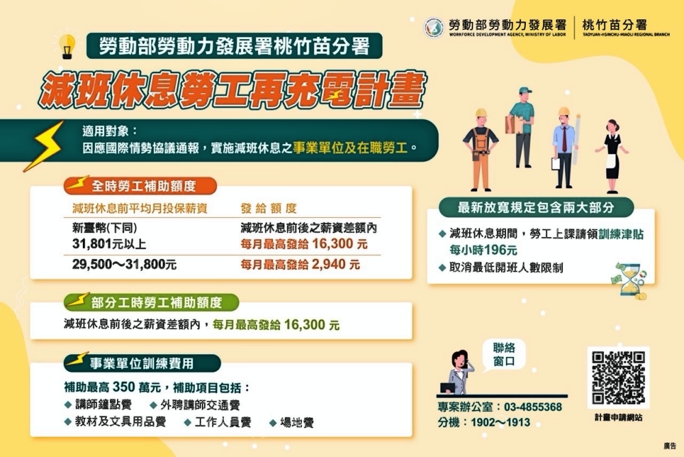 桃竹苗分署長賴家仁表示,在職訓練是企業因應整體經濟環境變化、強化競爭優勢的核心策略工具,在分署政策資源的挹注與專業輔導下,企業得以深化人力資本布局;除勞工再充電計畫外,強化版「僱用安定措施」所適用的行業,如雇主與勞工協商實施減班休息達30日以上,並向地方勞工主管機關完成通報,即可於實施滿30日次日起90日內,向桃竹苗分署申請薪資差額補助。相關減班休息資訊可至「補助企業辦理員工訓練計畫網站」( https://gov.tw/dVC ) 或「勞動部勞動力發展署桃竹苗分署」官方網站( https://thmr.wda.gov.tw/ )或電洽(03)485-5368分機1902至1913。