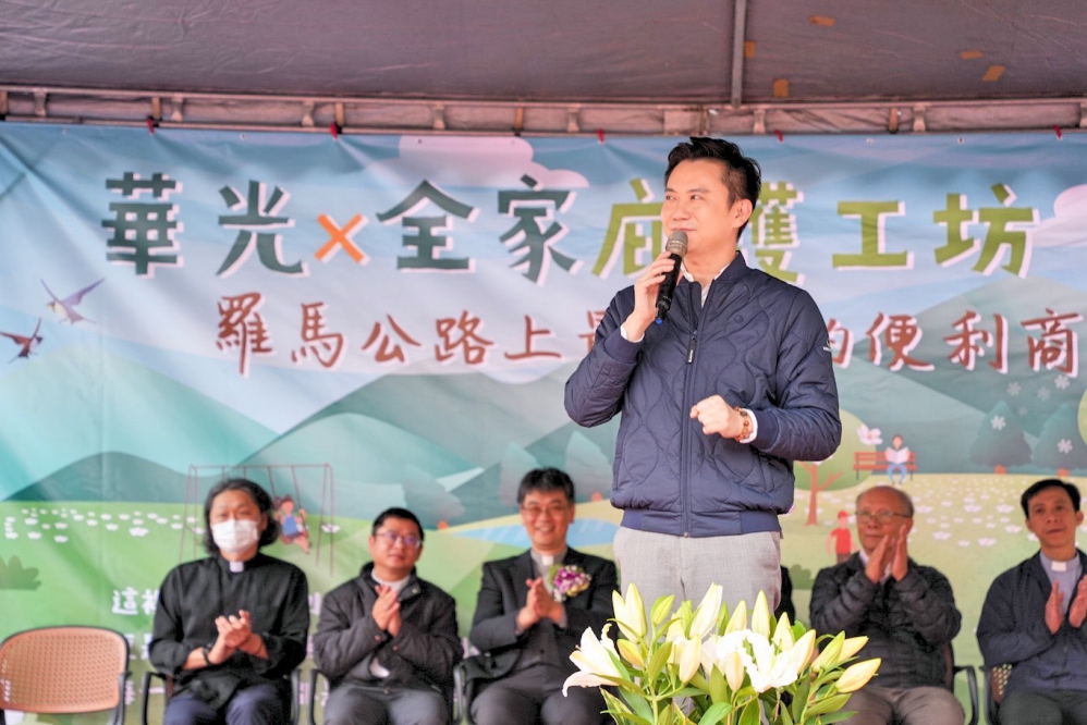 ▲由財團法人天主教華光社會福利基金會與全家便利商店合作設立的磊質庇護工坊(全家華光店)啟用儀式,新竹縣副縣長陳見賢(中)致詞。(圖/華光社會福利基金會提供)