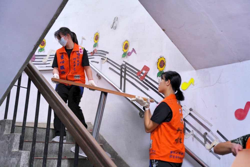 ▲國防大學理工學院志工同學們不分性別投入服務,兩人一組發揮合作默契,合力將體積龐大的廢棄長桌搬運下樓,展現青年學子的服務熱忱與活力。(圖/八德榮家提供)