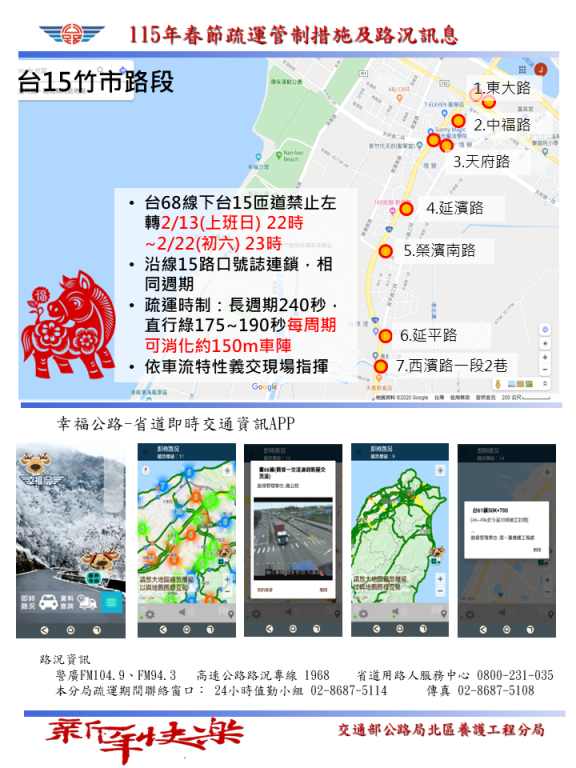 (2)台68線西行南寮匝道自2月13日(除夕前2日)22時至2月22日(初六)23時禁止左轉台15線南下,用路人需直行至台68線西行終點榮濱路再轉東大路或天府路匯入台15線南下。