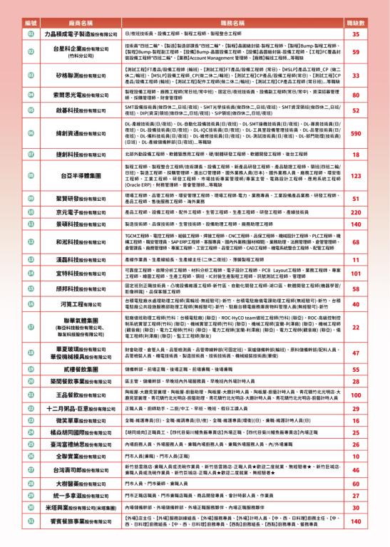 此次徵才活動從科技業到服務業,紛紛釋出具競爭力的職缺,其中以感測整合元件開發及製造大廠台亞半導體招募製程工程師、採購管理師、國外業務人員等上百個職缺,而在台門市已超過400家的大樹藥局開出門市人員及藥師職缺,2年以上資歷藥師年薪可破百萬,而且另有獎金制度,緯創資通更一口氣釋出高達500個職缺。