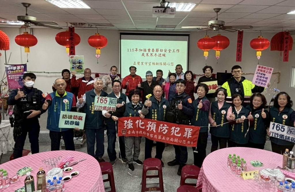 警五分局表示,加強宣導115年加強重要節日安全維護工作,由社區巡守隊隊長吳銅吉率領隊員與公園派出所,置重點於「防竊、防搶、防詐騙宣導」、「取締賭博犯罪」、「維護金融機構安全」等工作,結合強化巡守功能,強化社區內治安要點和易發生犯罪處所巡守,運用警民合作共同營造「平安、祥和、快樂」家園。 (臺南市政府警察局第五分局提供照片)