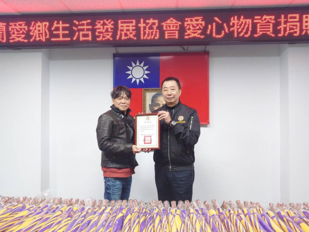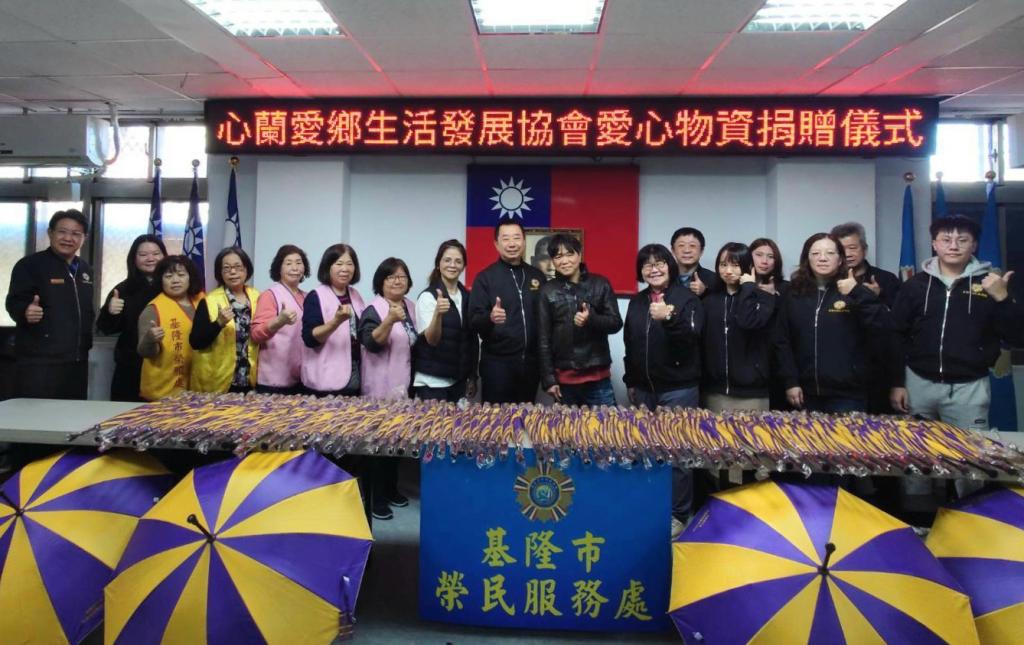 心蘭愛鄉生活發展協會劉理事長及建國里王里長共同表示,協會將持續捐贈愛心物資給榮服處,希望能提供榮民眷更多支援,此次協會訂製一批黃藍相間、非常適合長者在基隆多雨及夜間行走,醒目且安全拐杖雨傘,希望榮服處協助轉送給轄內榮民眷長者,以表達協會對他們關懷。