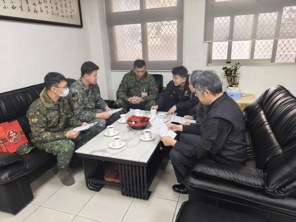 余處長4日偕同廖誠和總幹事及觀世音慈心會站長饒女士,會見澎湖防衛指揮部政戰主任王上校及相關幕僚等,針對農曆春節期間送餐服務,廣泛地交換意見,特別感謝陳指揮官大力協助與支持;另春節期間,除了獨居榮民(眷)固定送餐外,榮服處每天也會由專人致電關心榮民(眷)生活,並送上新年滿滿祝福。