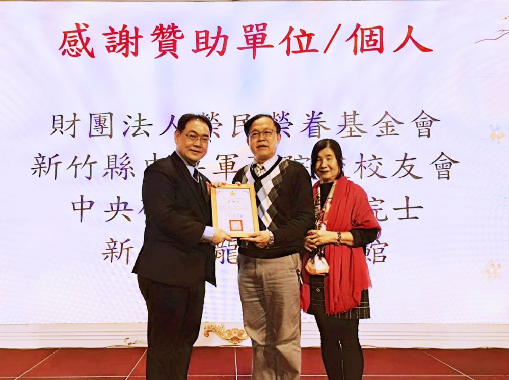 ▲新竹榮服處盛大「迎春納福團圓宴」相見歡暨圍爐活動,新竹榮服處鞠宗顯處長(左)頒贈感謝葉均蔚院士(中)及夫人張秀慧老師(右)攜手關懷清寒榮民向學子女。(圖/新竹榮服處提供)