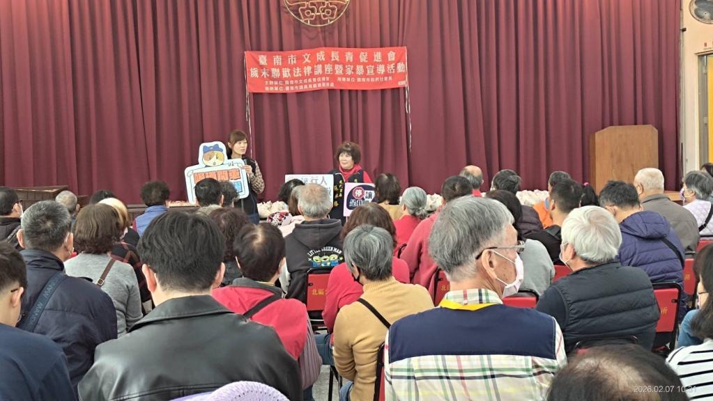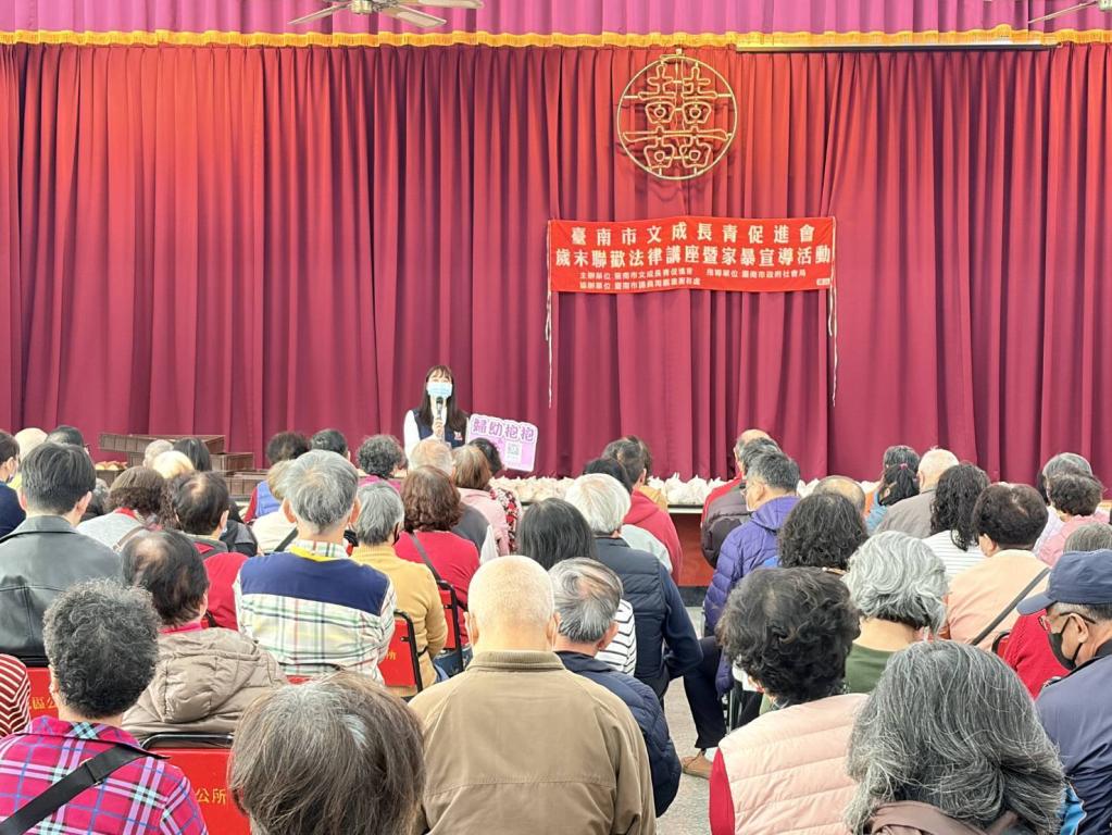 【勁報記者于郁金/臺南報導】為關懷社區長者與居民生活安全及法治需求,周嘉韋議員服務處與臺南市文成長青促進會於7日,假文元文成元美里聯合活動中心共同辦理「歲末聯歡法律講座暨家暴宣導活動」,結合歲末聯誼與安全宣導,邀請第五分局到場向里民進行交通安全、防詐騙及家庭暴力防治等多元且實用的安全宣導,讓長者在輕鬆互動氛圍中,學習與生活息息相關重要安全觀念。