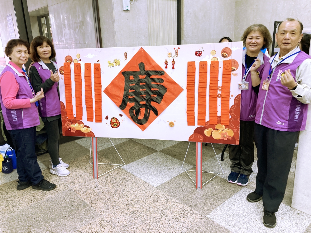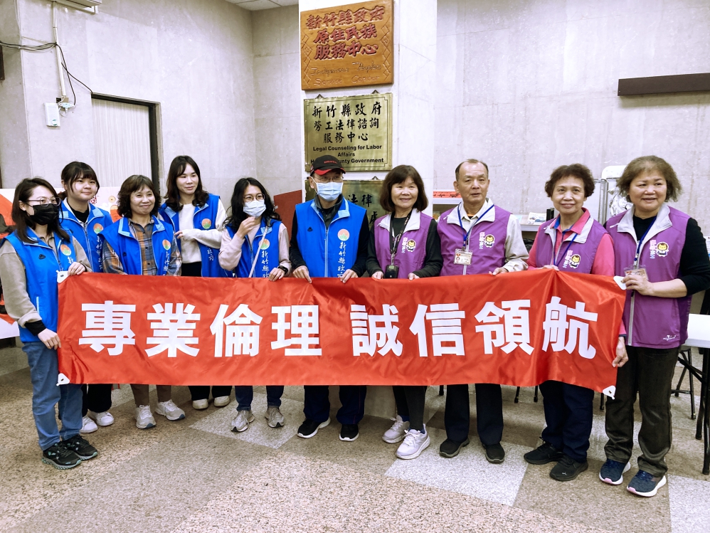 ▲竹縣府政風處結合文化局及消防局等所屬政風機構於春聯揮毫贈送活動現場設置廉政宣導區,透過寓教於樂的方式深化民眾對竹縣府廉能施政的認同與信賴。廉政志工們於宣導區前合影。(圖/竹縣府政風處提供)
