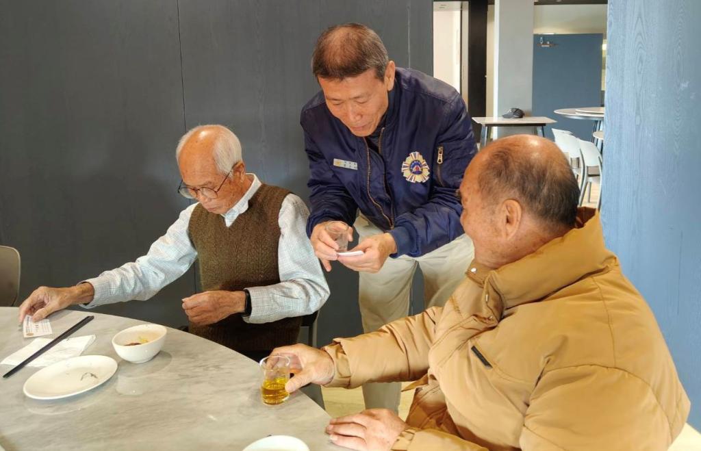 活動期間,由劉信義處長、彭致和副處長、李全順總幹事分批出席,親切向長輩寒暄致意;席間,不少長輩分享生活點滴,有人回憶年輕時從軍報國往事,也有人笑說已經很久沒有這樣「熱熱鬧鬧地吃一頓飯」;對平日獨居長輩而言,這場圍爐不只是一次用餐,更像是一場久違家庭團聚。