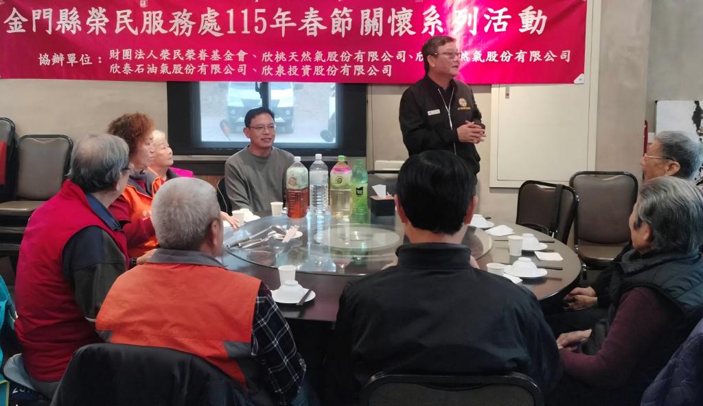 榮服處表示,同時感謝行政院金馬聯合服務中心吳增允執行長、烈嶼鄉代表會吳福全副主席、金寧鄉榜林村楊龍傳村長、金門縣後備空軍協會林長鴻榮譽會長等貴賓,親赴各場餐會向榮民長輩祝賀並提前拜年。