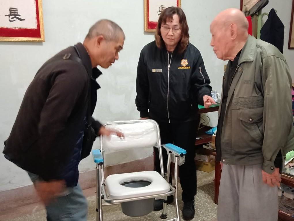 處長許淑菁指出,由於梁伯伯屬高風險關懷個案,於是偕同民雄鄉長林于玲共同前往探視,除指示協助向慈濟輔具中心申請四爪手杖及便盆椅等輔具外,另與民雄鄉公所協調分工加強訪視密度,同時請相關訪視人員善用御老系統;如有發現伯伯異常狀況,立即於系統中通報,讓相關單位專業人員均能同步掌握狀況,落實「一點生變 多方應援」照護機制,共同維護長輩安全。隔日慈濟師兄即將輔具親送到府服務,梁伯伯非常滿意。
