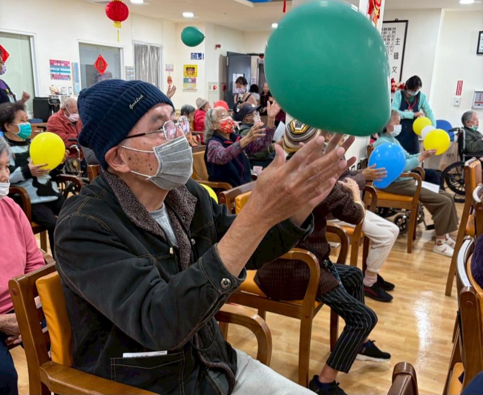 接續,搭配多首懷舊老歌,引導長輩進行簡易舞步與律動,不僅喚起過往過年回憶,也促進認知刺激與情緒穩定,讓身心在熟悉旋律中逐漸放鬆。
