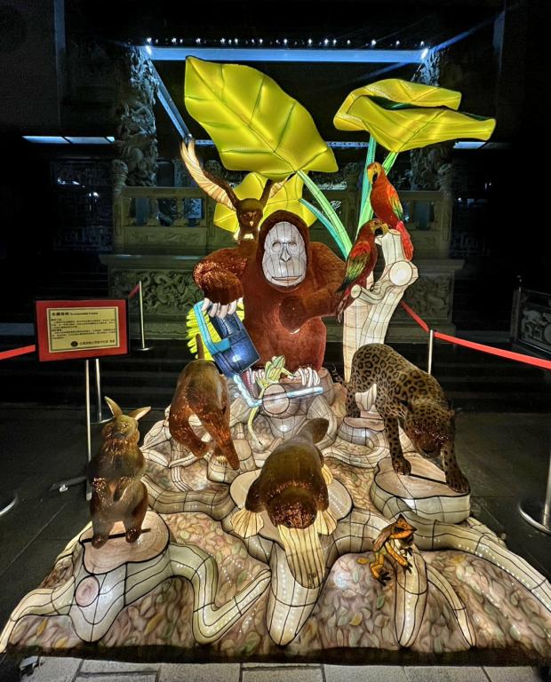 2.永續森林(展示地點:天公壇) 此作品榮獲「2025 全國燈會比賽優選」。這是一座難度極高的「牙籤花燈」,創作者展現極致耐心,將約十萬根日常牙籤逐一黏貼,運用牙籤天然紋理模擬動物毛髮與羽翼,呈現驚人的立體感與細膩質感。作品傳達人類應覺醒於環境過度開發,強調森林保護的重要性。