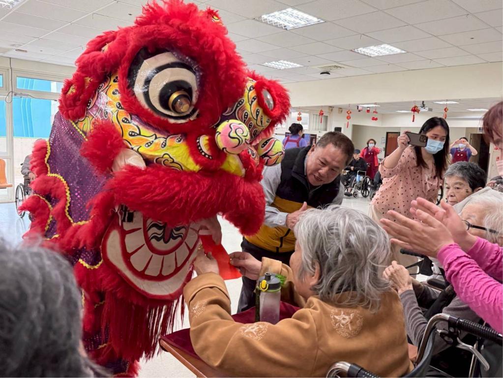 為讓行動不便住民長輩能感受8節慶氛圍,特別規劃醒獅團上至怡心堂二樓,讓長輩近距離觸摸獅身、感受新春祝福與喜氣。
