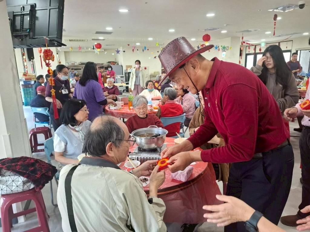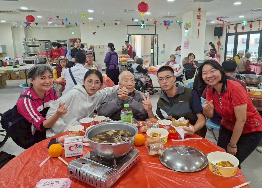 特別的是,聚餐時段,特別為前來陪伴長輩的家屬貼心準備「火烤兩吃」圍爐餐點,邀請家人與長輩一同圍坐共享美食,在熱氣蒸騰與烤香四溢中,拉近彼此距離;家屬陪著長輩動手烤肉、夾菜盛湯,邊吃邊聊,笑聲不斷,現場宛如溫馨家庭團圓飯,讓年節團聚更顯完整而有溫度。