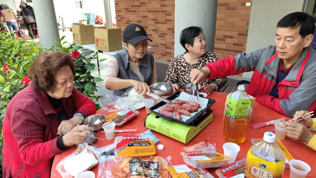 活動現場香氣四溢,藥膳土雞火鍋湯底滾滾翻騰、烤肉架上美食滋滋作響,長輩們圍坐同桌,親手翻烤食材、分盛熱湯,彼此分享美食與笑語,現場氣氛熱鬧又溫馨。