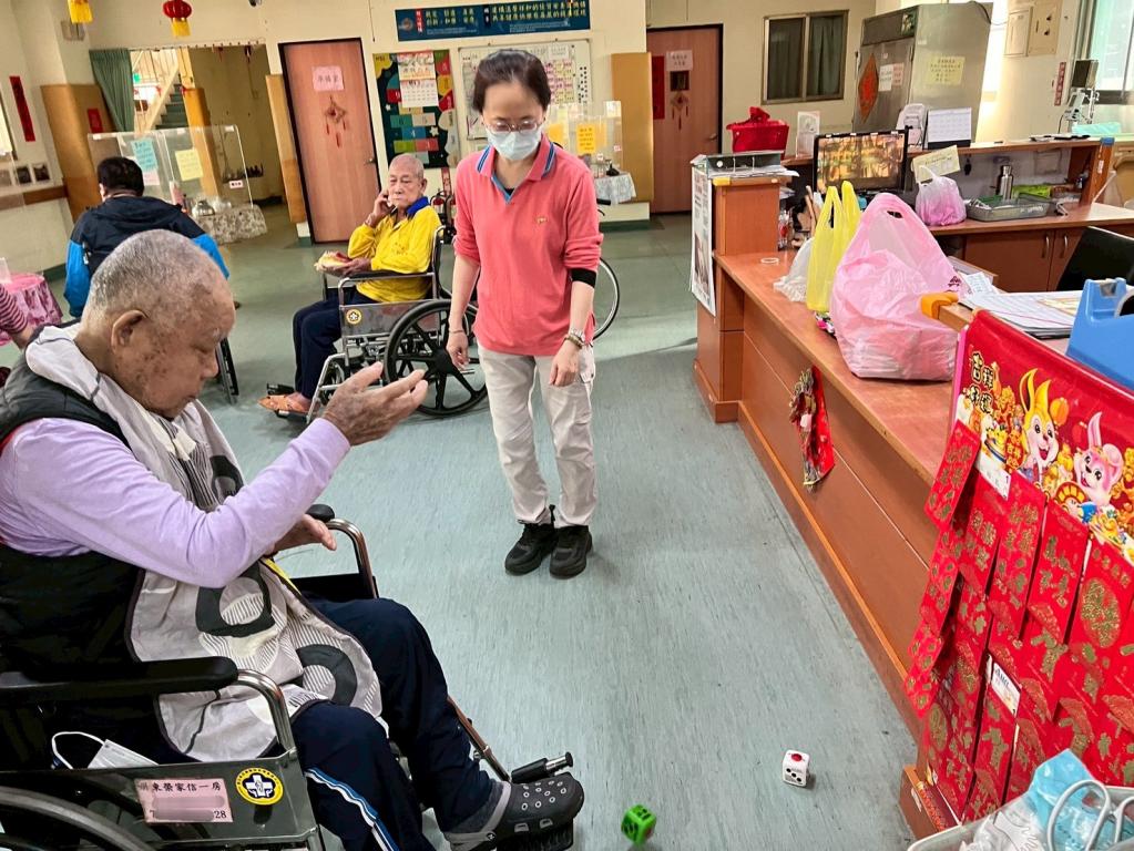 為增添年節氣氛,現場也播放喜氣洋洋新年歌曲,搭配應景布置與春節裝飾,讓長輩沉浸在熱鬧過年時光;透過簡單有趣擲骰子及抽抽樂遊戲,不僅活絡手部動作與腦力反應,也讓大家在互動中找回童心與快樂。