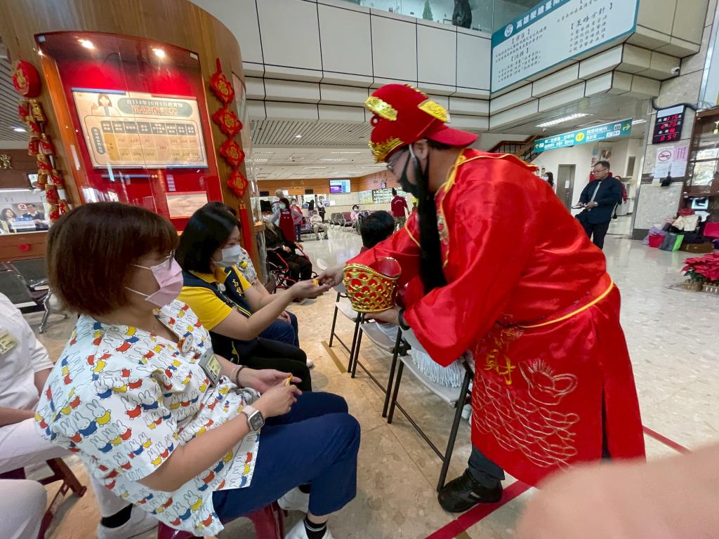 團拜活動於院內三樓會議室舉行,員工代表齊聚一堂,氣氛溫馨熱絡;院方準備貼有「福」、「吉」、「平安」字樣椪柑,及糖果、餅乾與養生茶供同仁共享;椪柑寓意大吉大利,甜點象徵幸福圓滿,養生茶則傳遞健康長壽祝願,讓現場洋溢濃厚年節氣息。