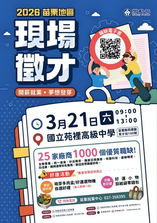 為協助失(待)業民眾年後順利就業機會,並促進在地產業發展,勞動部勞動力發展署桃竹苗分署3月將於苗栗地區辦理2場次現場徵才活動,共邀請62家企業,釋出2,600個工作機會。首場徵才於3月5日在竹南科學園區行政服務中心3樓(苗栗縣竹南鎮科研路36號)登場,緊接於3月21日在國立苑裡高中學生活動中心(苑裡鎮育才街10號)辦理,兩場活動職缺多元、活動豐富,歡迎有求職意願的民眾親臨現場,搶得年後轉職先機。