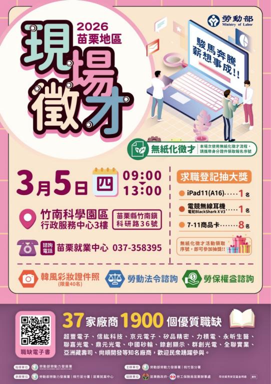 3月5日竹南場配合AI應用擴展及半導體先進製程發展趨勢,邀集智邦科技、中國砂輪、欣興電子、矽品精密、京元電子、京鼎精密及信紘科技等上市櫃知名公司,釋出研發工程師、產品工程師、設備工程師及技術員等前景看好、福利完整的高薪職缺。服務業「薪」情同樣亮眼,如藏壽司提供月薪52K以上店長儲備幹部,搶攻服務業人才。活動當天採用「無紙化徵才」,民眾攜帶身分證件完成求職登記,即有機會抽中iPad 11、電競無線耳機及7-11商品卡等好禮,現場另有專人提供勞動法令、勞工保險諮詢服務及「韓風證件照」40組,助求職者以最佳狀態迎戰職場。