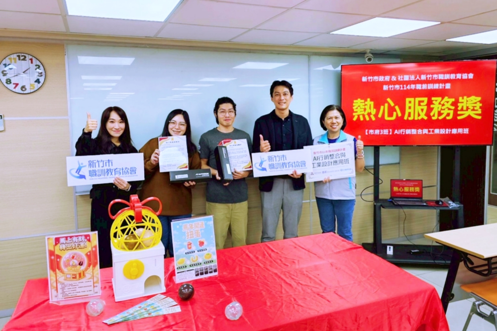 ▲新竹市政府吳達偉處長(右2)、李蘭珠科長(右1)、新竹市職訓教育協會 鄔佩儒執行長(左1)與AI行銷整合與工業設計應用班熱心服務班代表們合照。(圖/新竹市職訓教育協會提供)