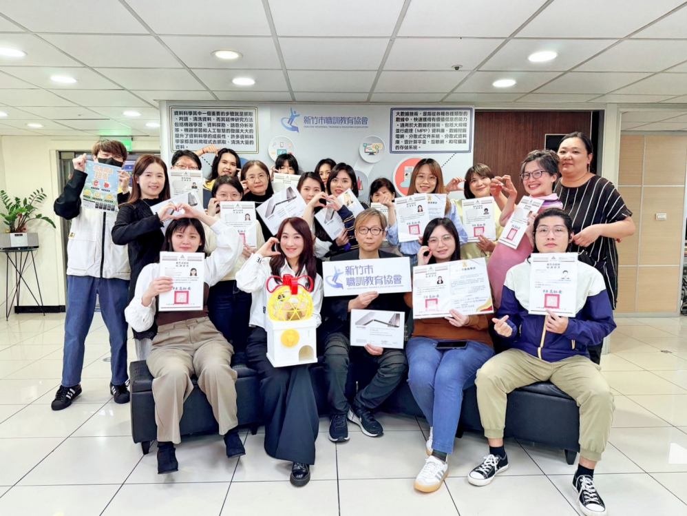 ▲新竹市職訓教育協會鄔佩儒執行長(前排左2)、段煥章老師(前排左3)及AI行銷整合與工業設計應用班全體結訓學員。(圖/新竹市職訓教育協會提供)