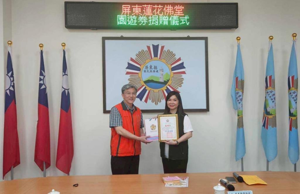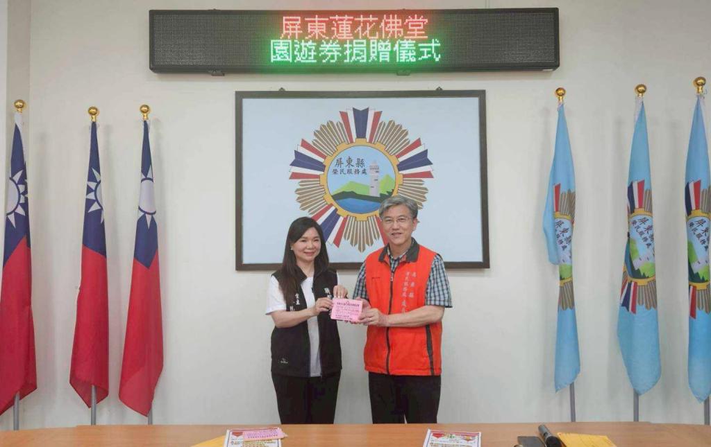 【勁報記者于郁金/屏東報導】為關懷屏東地區榮民眷,屏東蓮花佛堂近日捐贈一批園遊券,並由屏東縣榮服處與服務團隊代表接受;這些園遊券將發放給有需要榮民眷及社福機構和團體,目的是希望讓更多榮民眷能夠參加即將舉行慈善園遊會,感受來自社會關愛與溫暖。