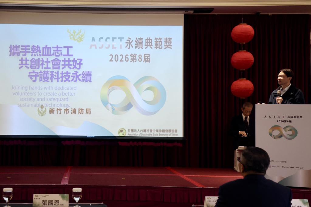 新竹市推動永續城市再創佳績!新竹市消防局近日參加社團法人台灣社會企業永續發展協會主辦的「2026第八屆ASSET永續典範獎」,以「攜手熱血志工共創社會共好.守護科技永續」為主題,順利榮獲「社會創新獎(社會共好組)」殊榮,是此次唯一獲獎的政府單位,展現公部門在社會共融與科技永續上的卓越創新力。頒獎典禮由經濟部政務次長何晉滄頒發獎座,消防局秘書彭忠禮代表市府團隊出席受獎。