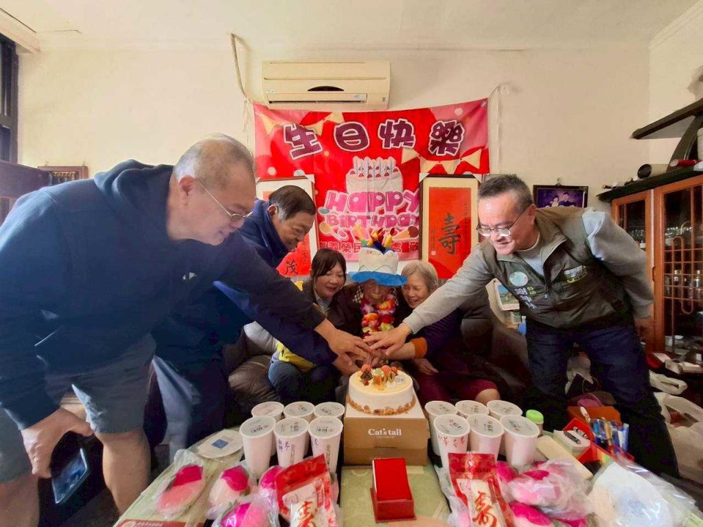 大夥溫馨話家常並齊唱〈生日快樂歌〉後,許處長、李村長等也輪流獻上祝福,祝福何伯伯平安健康呷百二,氣氛溫馨。