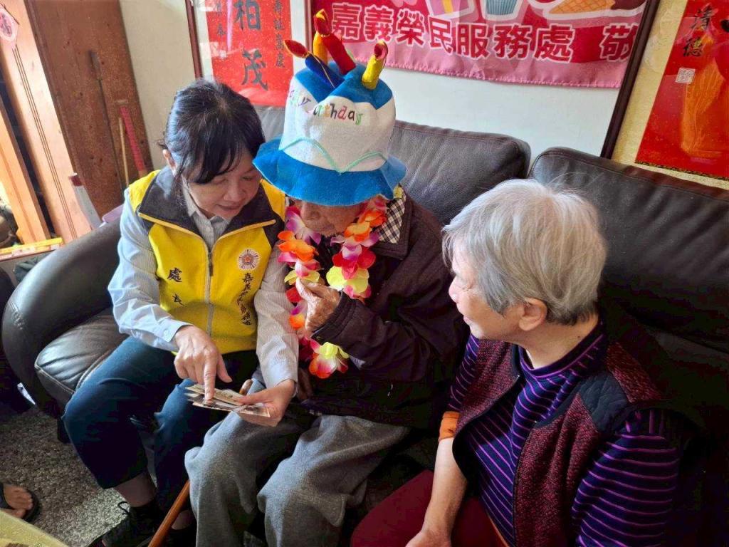 【勁報記者于郁金/嘉義報導】嘉義榮服處為居住嘉義縣水上鄉榮民何永忠伯伯歡喜賀壽,由處長許淑菁特率責任區輔導員、社區志願服務組長、替代役及榮欣志工們,偕同嘉義縣水上鄉回歸村李福來村長到長輩家中賀壽,與何伯伯伉儷、兒子共同歡慶何伯伯百歲壽辰,氣氛溫馨。