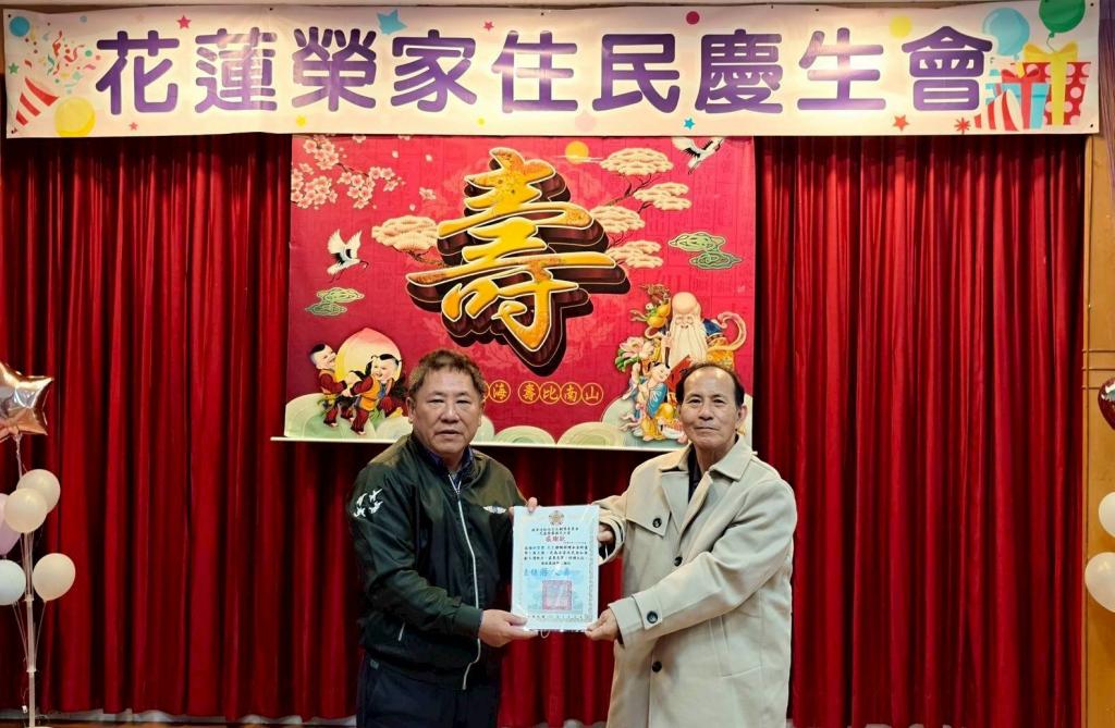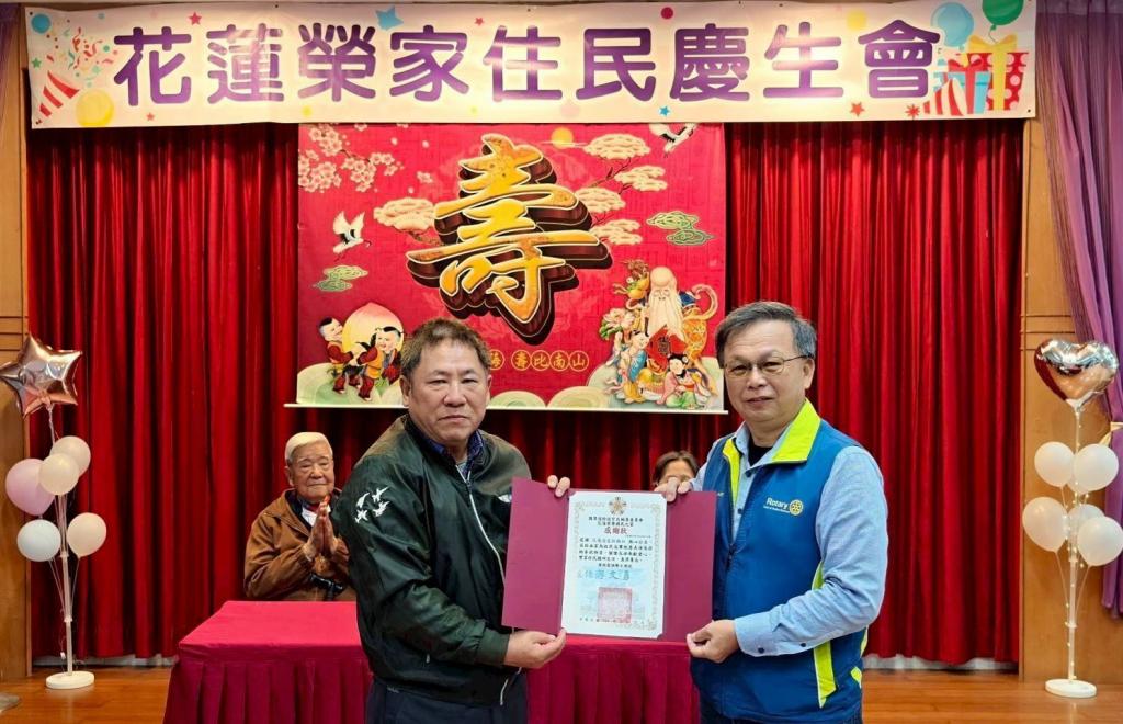 花蓮港區扶輪社特別捐贈本次慶生會點心禮盒,讓每位住民都能收到一份溫暖心意;家主任游文勇特別致贈感謝狀,表達榮家與全體住民最誠摯謝意。
