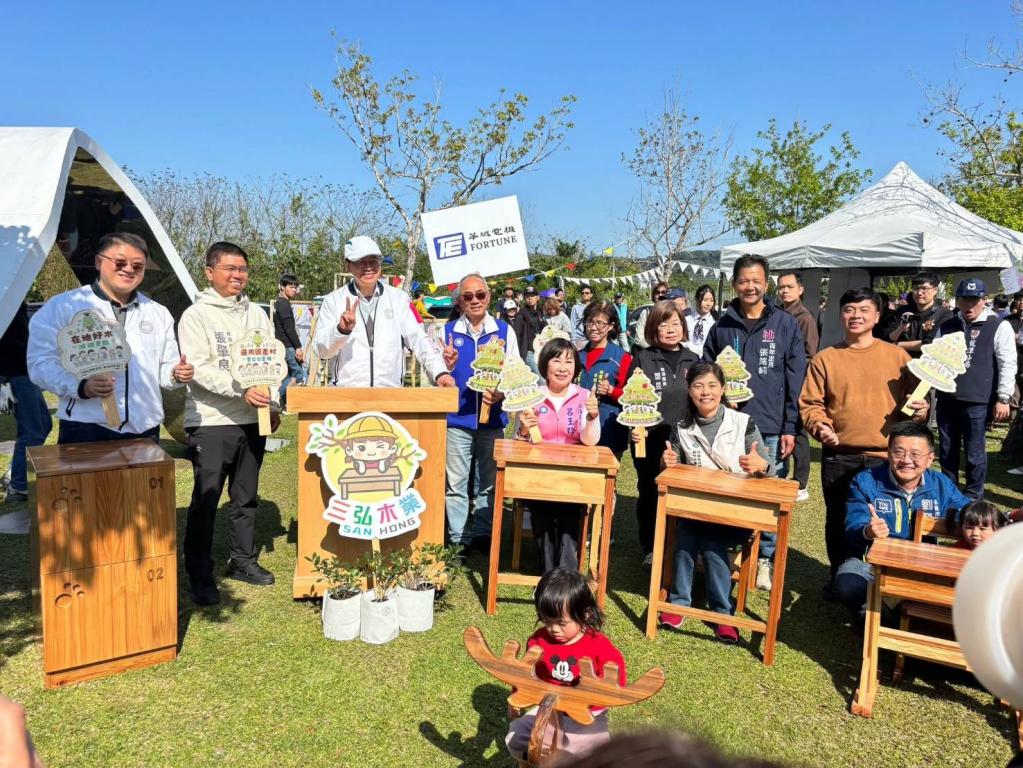 ▲115年度桃園市植樹節活動熱鬧揭幕,首次在植樹節一同展示國產材課桌椅。(圖/桃園市農業局提供)