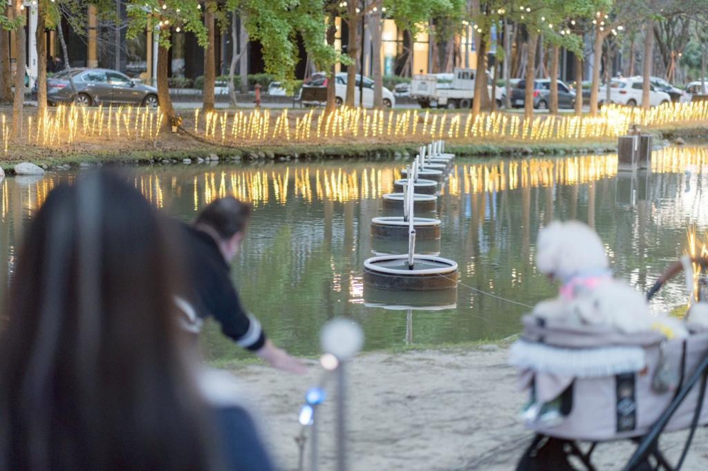 在互動體驗方面,今年光節特別強調全齡參與。人氣互動裝置「水漂」結合感測科技與聲光效果,讓民眾透過簡單的互動動作,在水面與光影之間創造變化,成為展區中最受歡迎的裝置之一。閉幕當天舉辦的「雙人水漂大賽」,更吸引多組長輩與晚輩一同參與,在科技與藝術交織的空間裡留下跨世代互動的溫馨畫面。