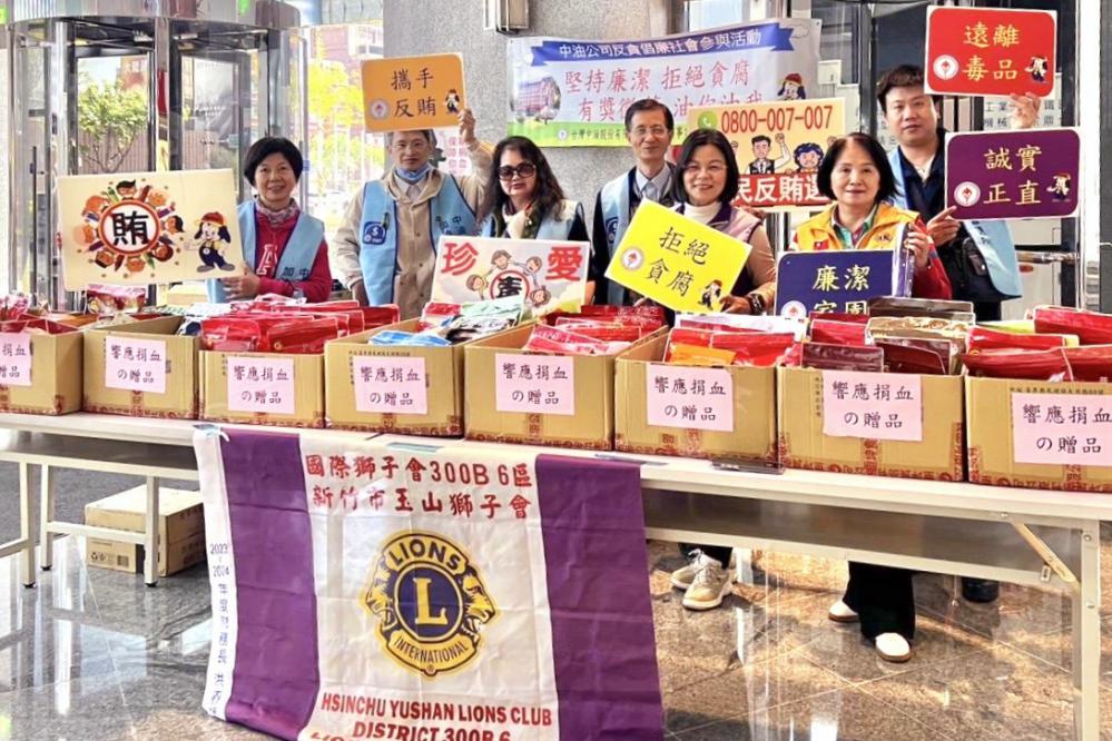 ▲台灣中油竹苗處攜手新竹捐血中心、玉山獅子會共同舉辦「中油百萬CC熱情公益捐血活動」,並結合有獎徵答宣導廉政暨反詐。台灣中油竹苗處代表、新竹捐血中心組長黃莉雯(右3)、玉山獅子會前會長葉夢芳(右1)及鄭家琦會長(左1)一同合影。(圖/台灣中油竹苗處提供)