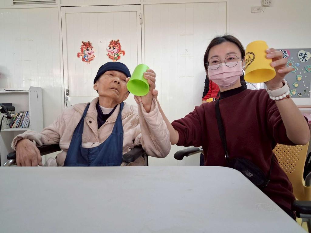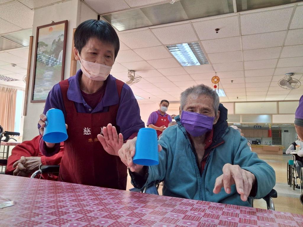 活動中,工作人員運用日常生活常見杯子作為樂器,搭配簡單節奏及音樂,引導長輩透過拍手、敲杯與律動等方式進行節奏練習;長輩們隨著音樂節拍專注地敲擊杯子,在反覆練習中逐漸掌握節奏,不僅訓練手眼協調與專注力,也在互動過程中增進彼此交流,讓身心都獲得良好刺激與放鬆。