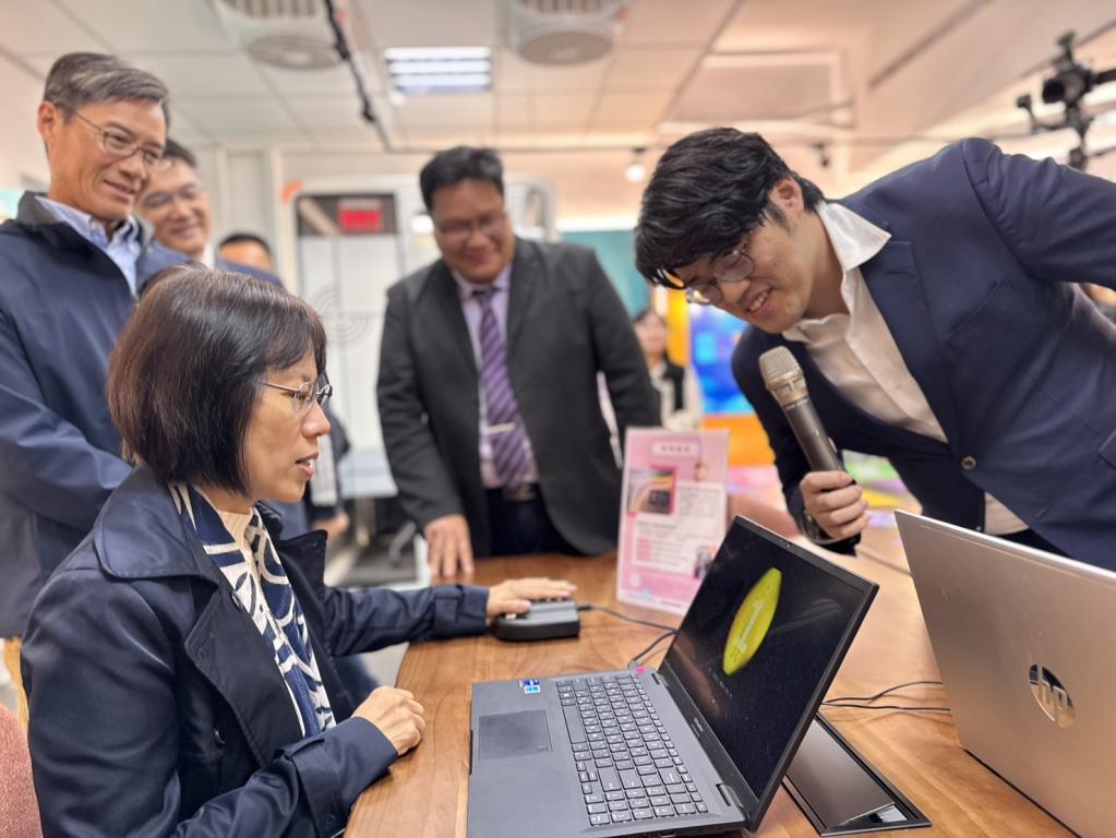 ▲桃竹苗分署清華分館今日啟用,由青年職涯大使(右)向勞動力發展署長黃齡玉(左)介紹「氣場解密」,分析青年當下的能量與信心,引導青年以更穩定的心理狀態迎接面試挑戰。(圖/桃竹苗分署提供)